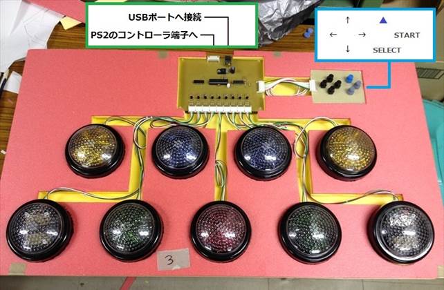 9つのLED付きボタンや十字キーなどのボタンの押下情報を、中央上部の回路でPSコントローラの仕様に合わせた信号に変換してPS2と通信しています。